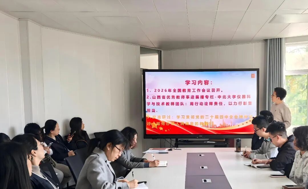 会议首先集体学习了2026年全国教育工作会议精神,明确了当前教育工作的方向与重点。随后,全体党员共同观看了“山西省优秀教师事迹展播”节目中关于中北大学仪器科学与技术教师团队的先进事迹,感悟其潜心育人、敬业奉献的崇高精神。